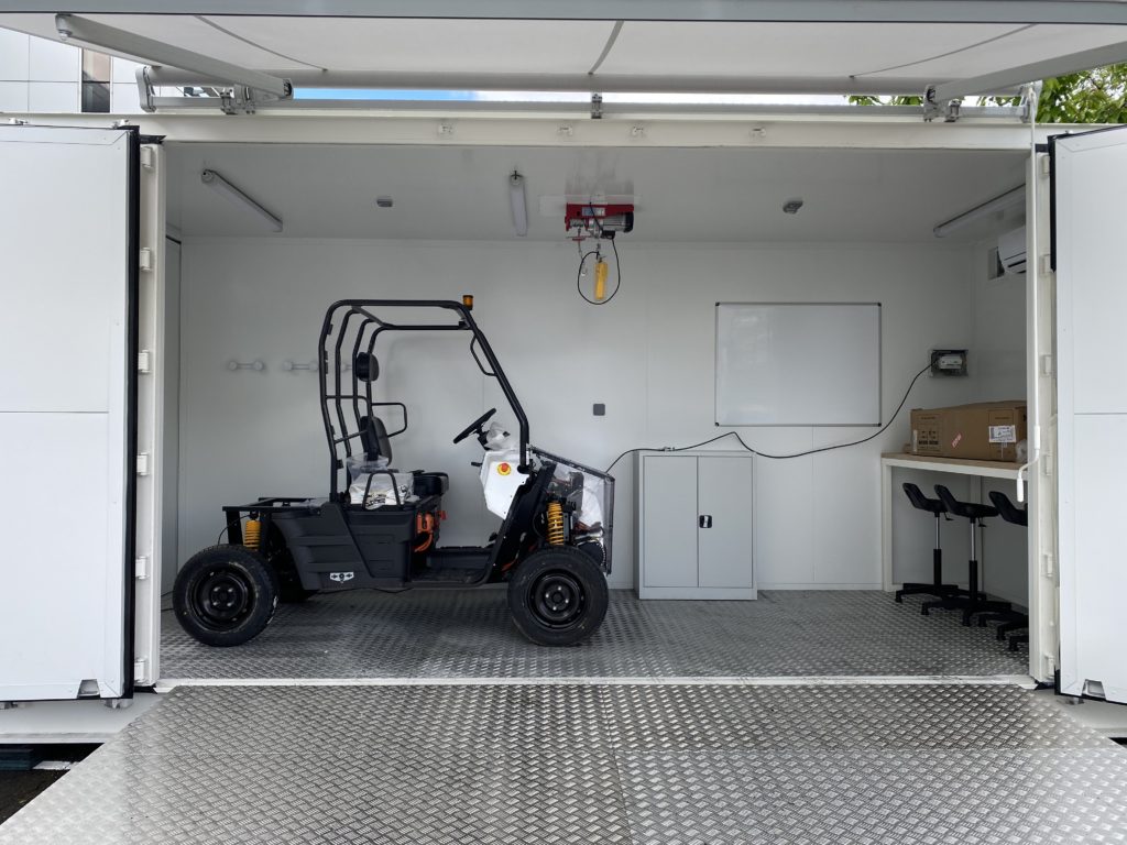 Espace pour les ingénieurs de cette formation, ce container est équipé en petite salle de travaux pratiques et/ou de projets (tableau, armoire, chaises, équipement de mesures, connexion internet, …). Il est dédié à l’installation d’un véhicule électrique, qui sera un outil pédagogique pour les apprenti-es ingénieur(e)s de la filière.